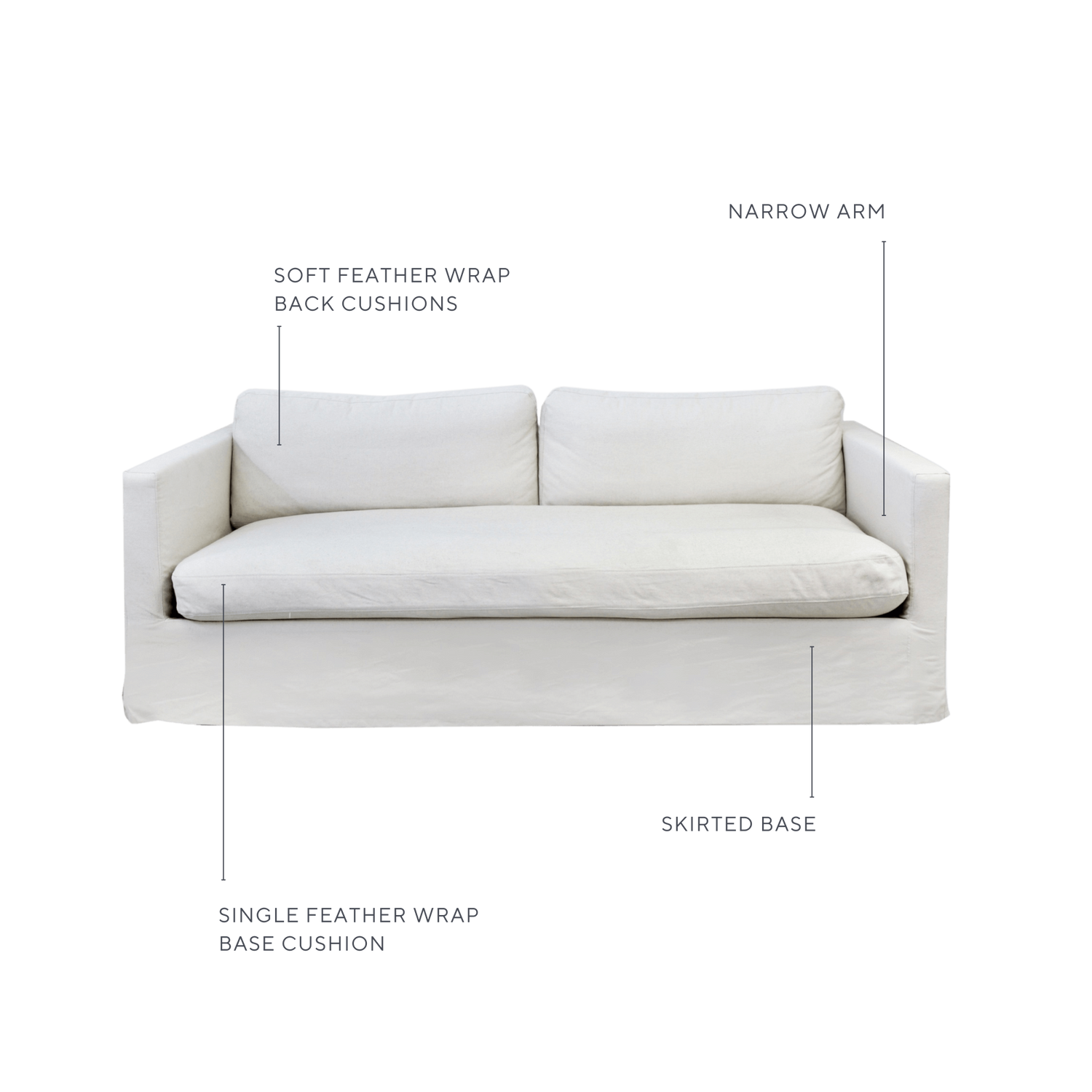 - • Materials: Solid timber frame & oak feet, linen/cotton removable covers, foam & feather wrapped base and feather back cushions